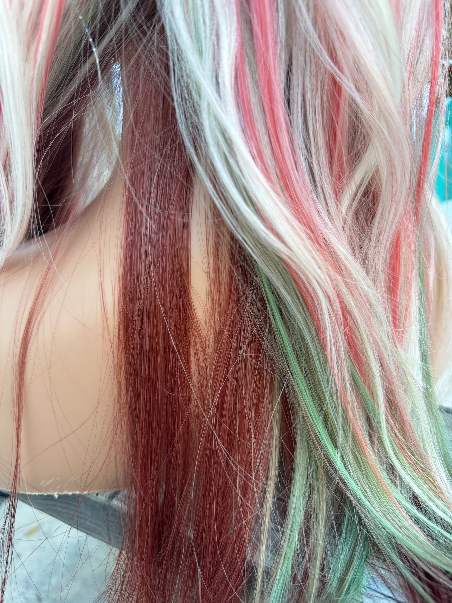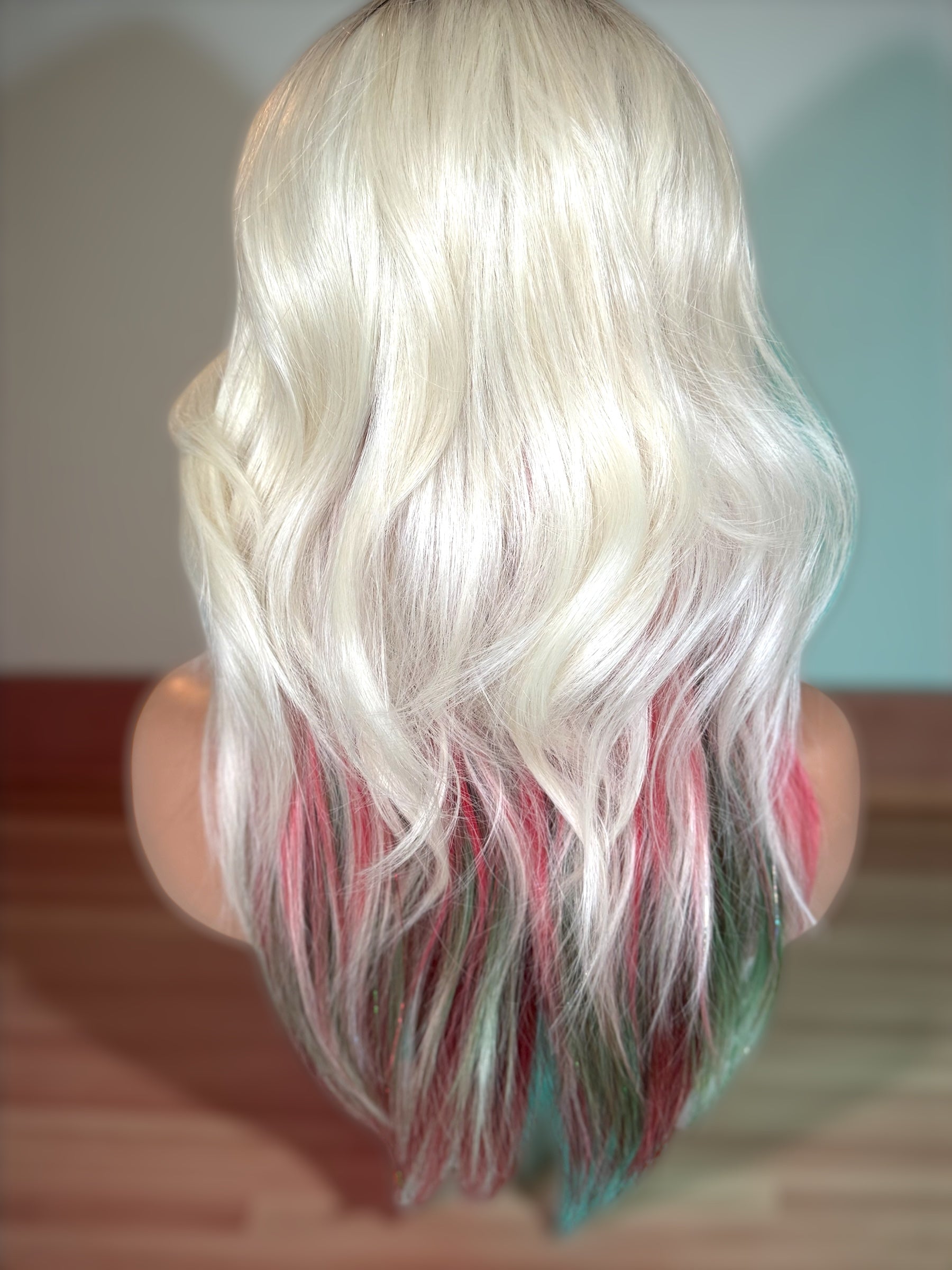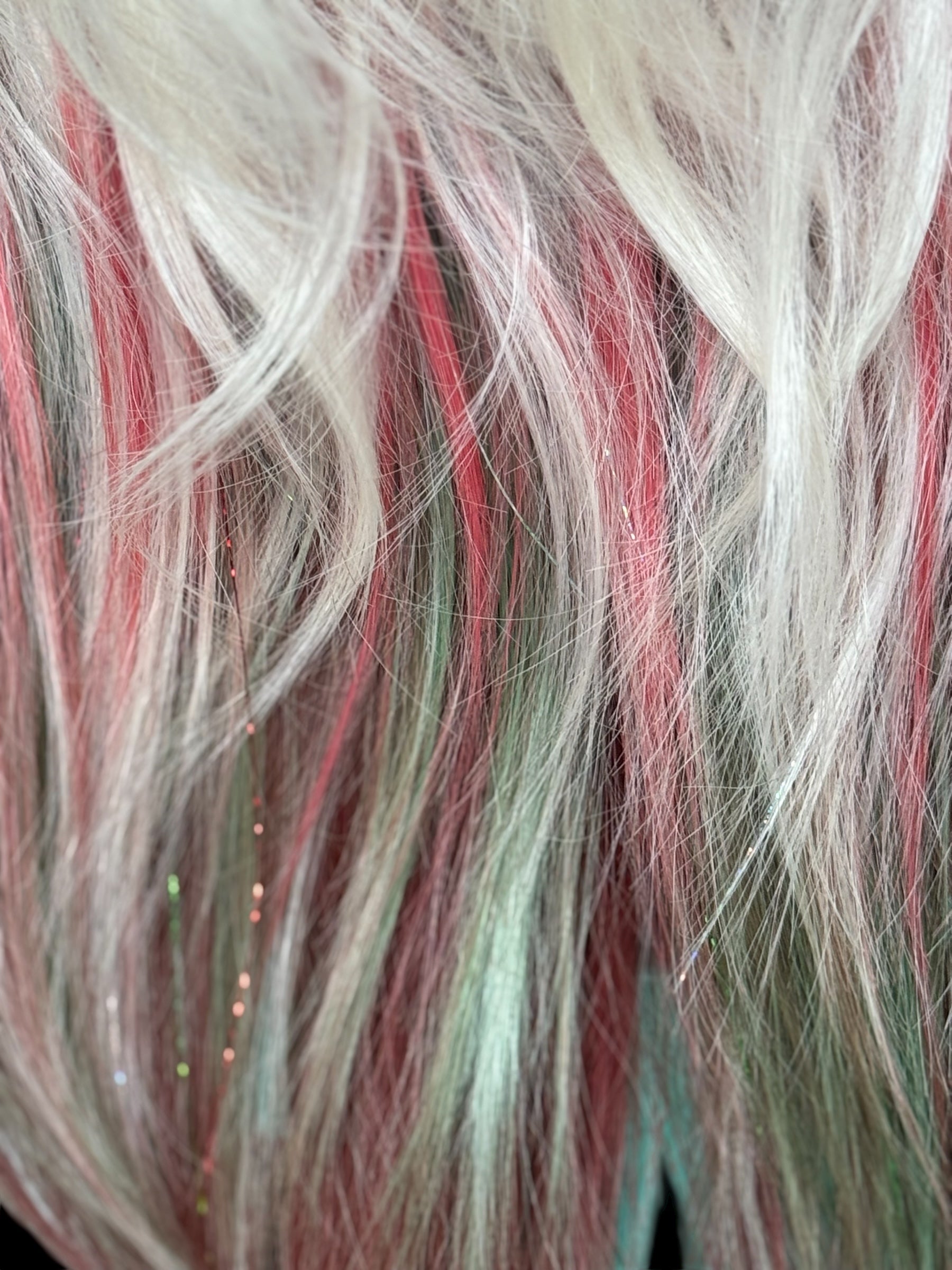 This is not a preorder! It is in stock and customized to order. All will be the same but with unique customization variations . These are hand dyed and tinsel is removable . It is a 13x4 futura fiber heat resistant wig. If you would like more tinsel please email us . If you would like teal or black added please email us . If you have any specifications we can try to add them let us know . Such as dying just the tips red . Half red half green etc.