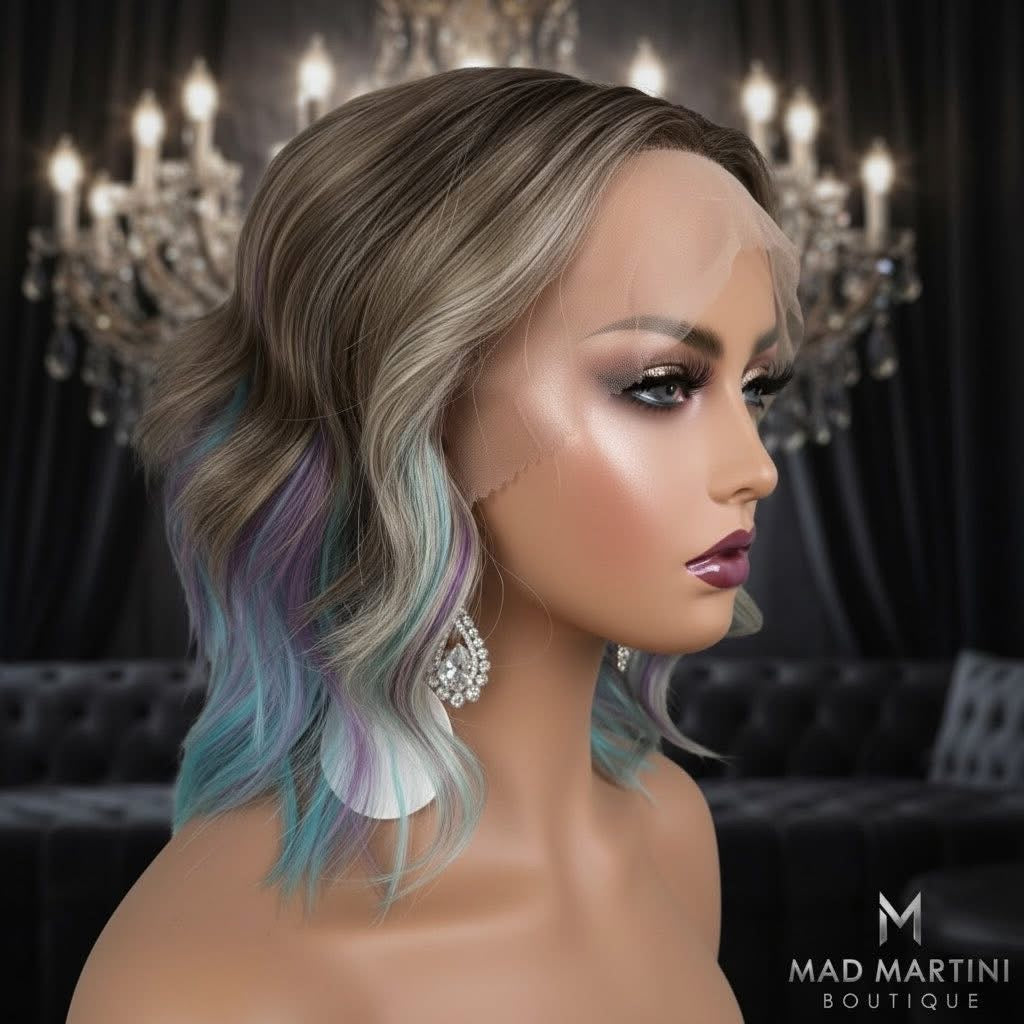 Color Description: A multidimensional custom blend featuring Stunning Caramel Blonde, Sandy Blonde, Lavender with eye catching Mint and Brown Blend.Crafted to look effortlessly expensive and uniquely yours. The first picture is of the ACTUAL completed wig.