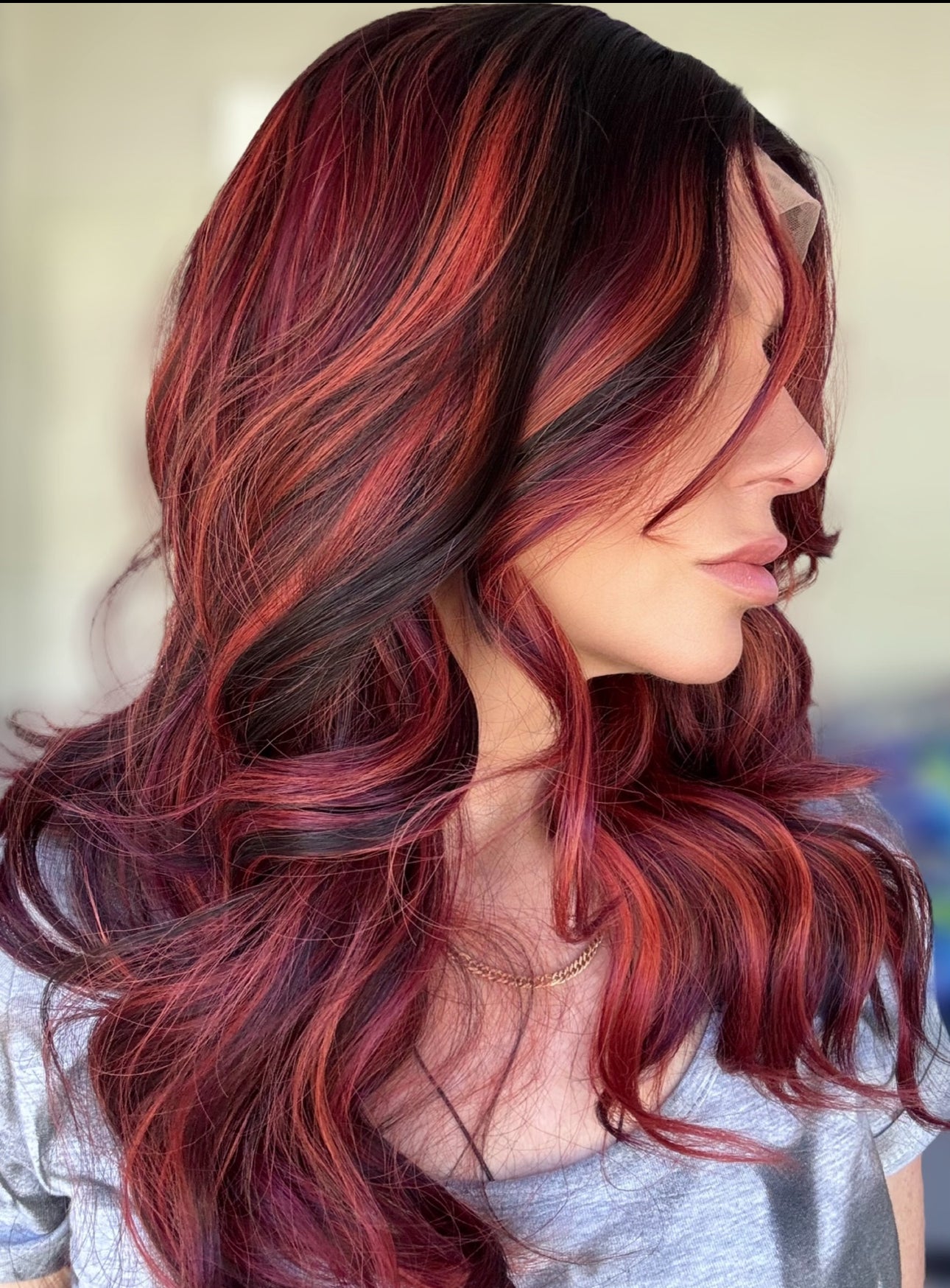 Color: rich highlights, dark base color with vibrant, flowing shades of burgundy and hints of Crimson highlights.