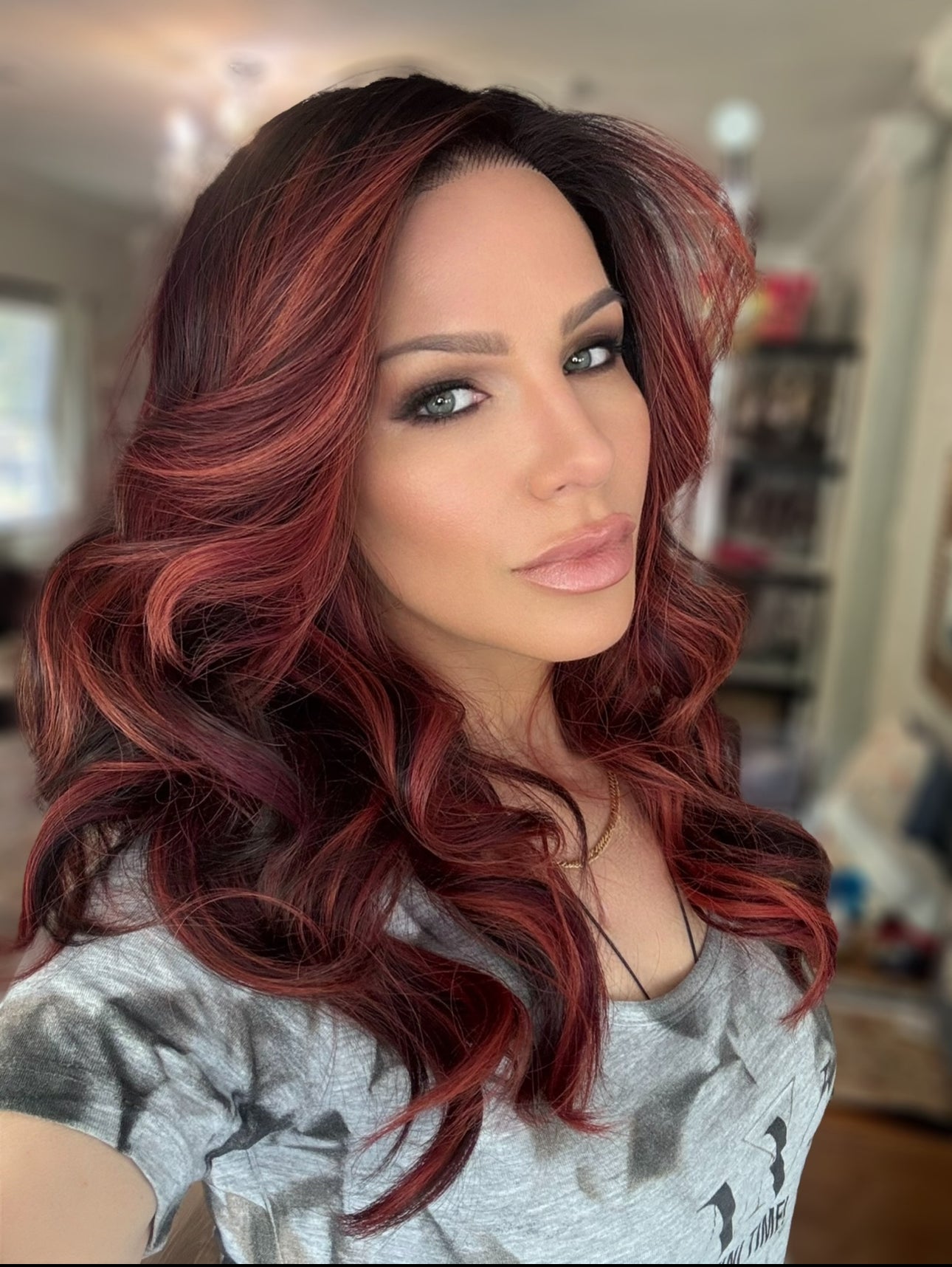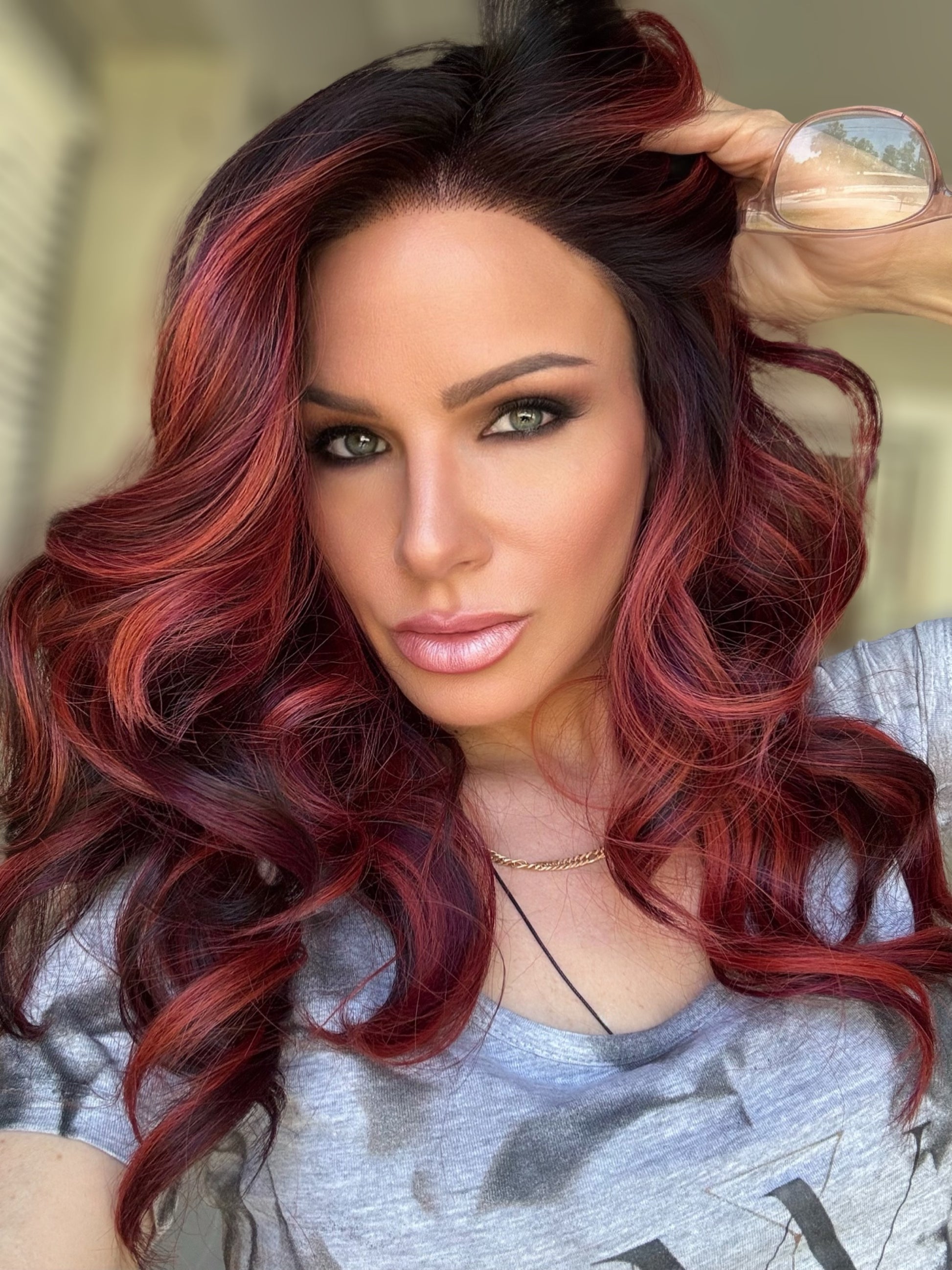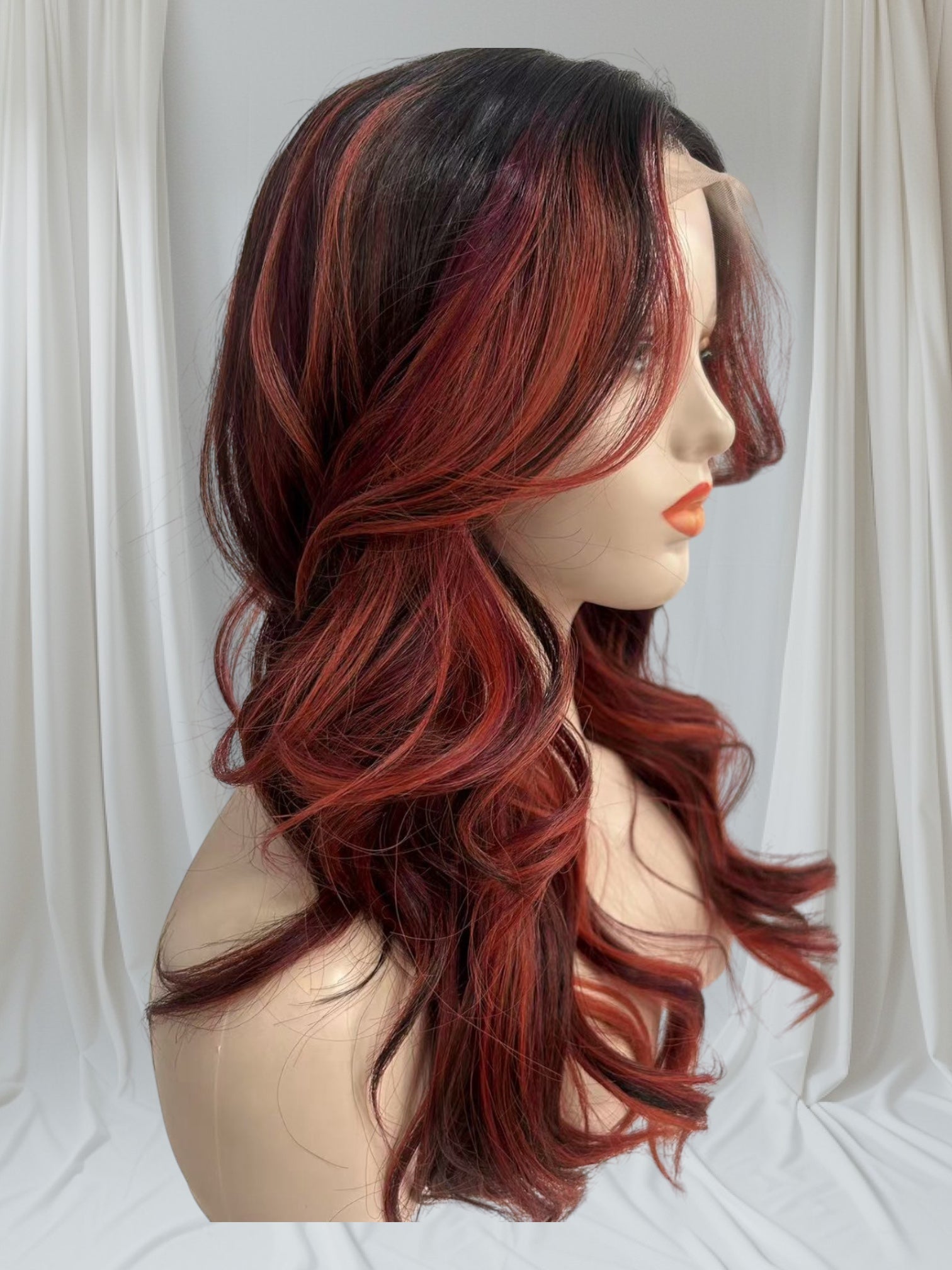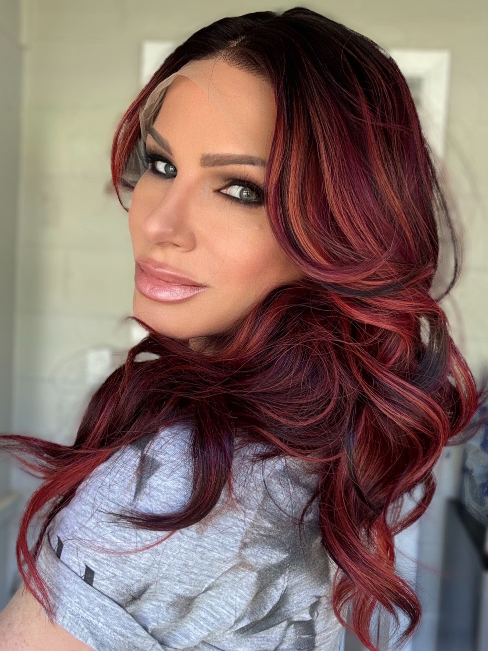 This absolutely gorgeous and spicy wig has a rich highlights, dark base color with vibrant, flowing shades of burgundy and hints of Crimson highlights. The combination creates a striking effect.