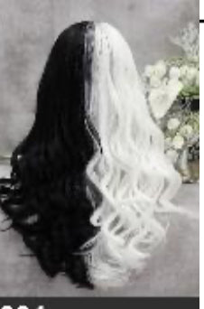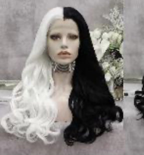 "Upgrade your look with CRUELLAS CURSE lace front wig. Made with premium heat-resistant synthetic fiber, this 25-inch loose body wave wig boasts a bold block-style platinum and black design. The adjustable straps and standard cap size provide a comfortable fit. Perfect for any occasion, unleash your inner villain with CRUELLAS CURSE."