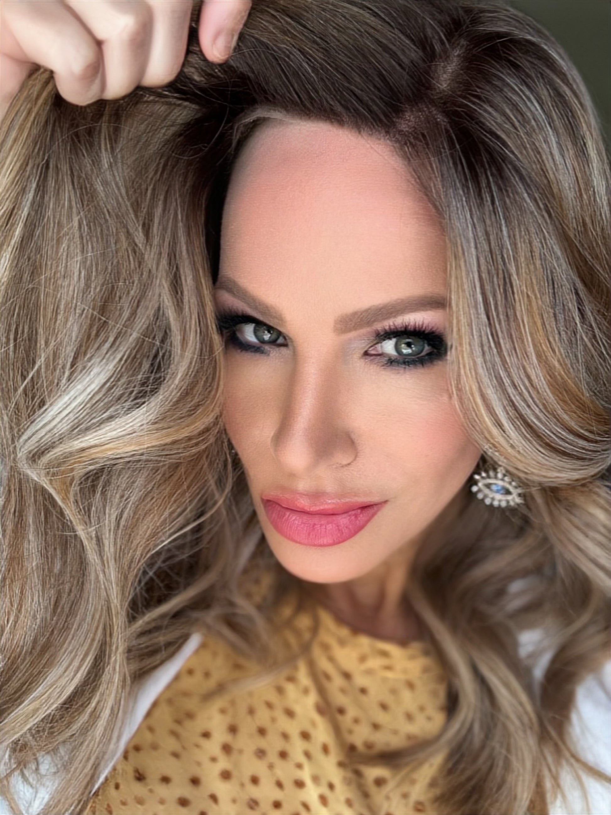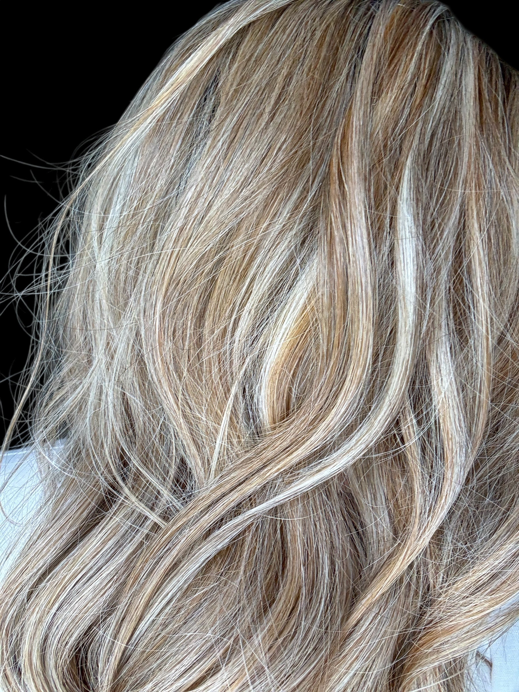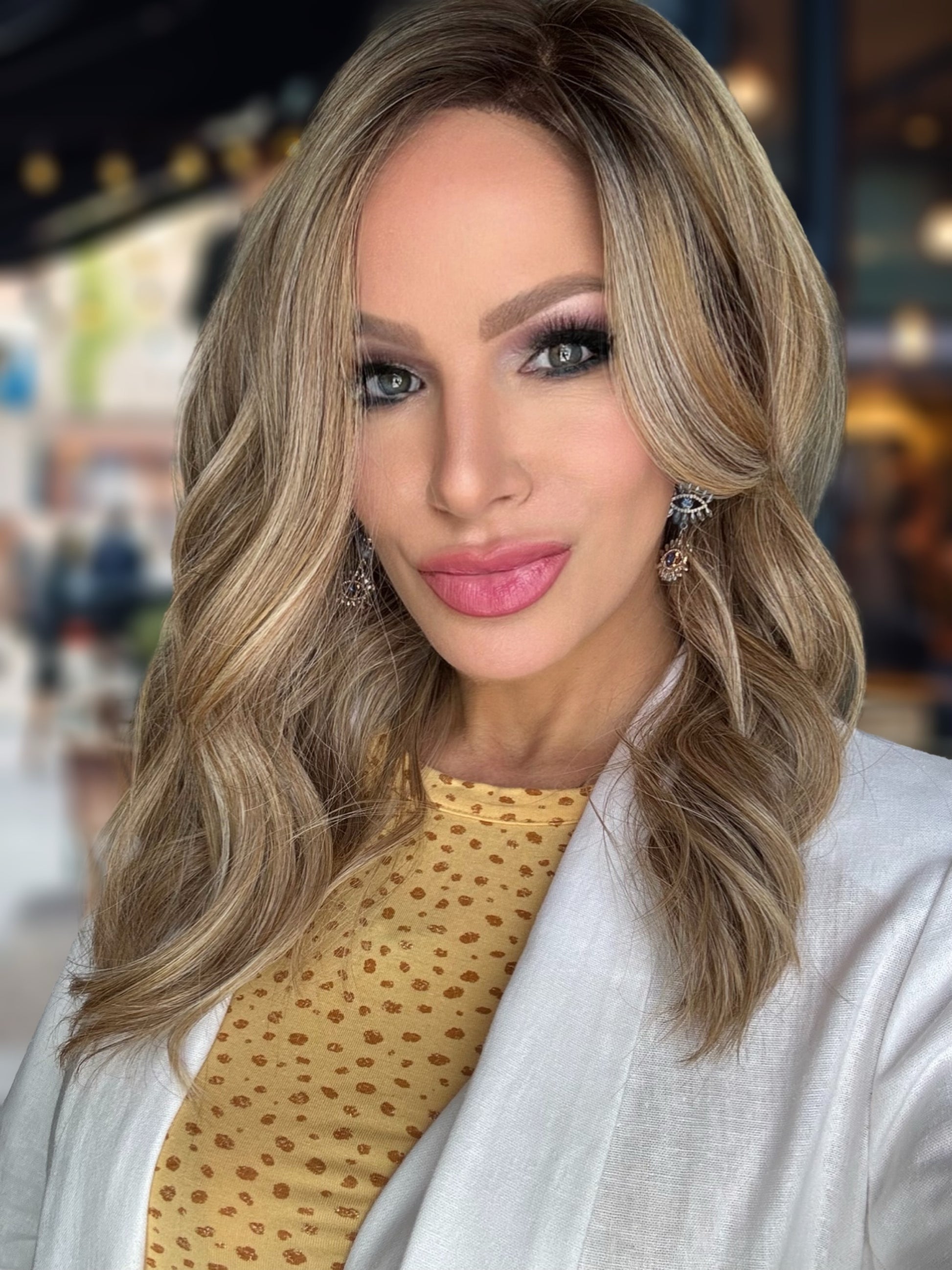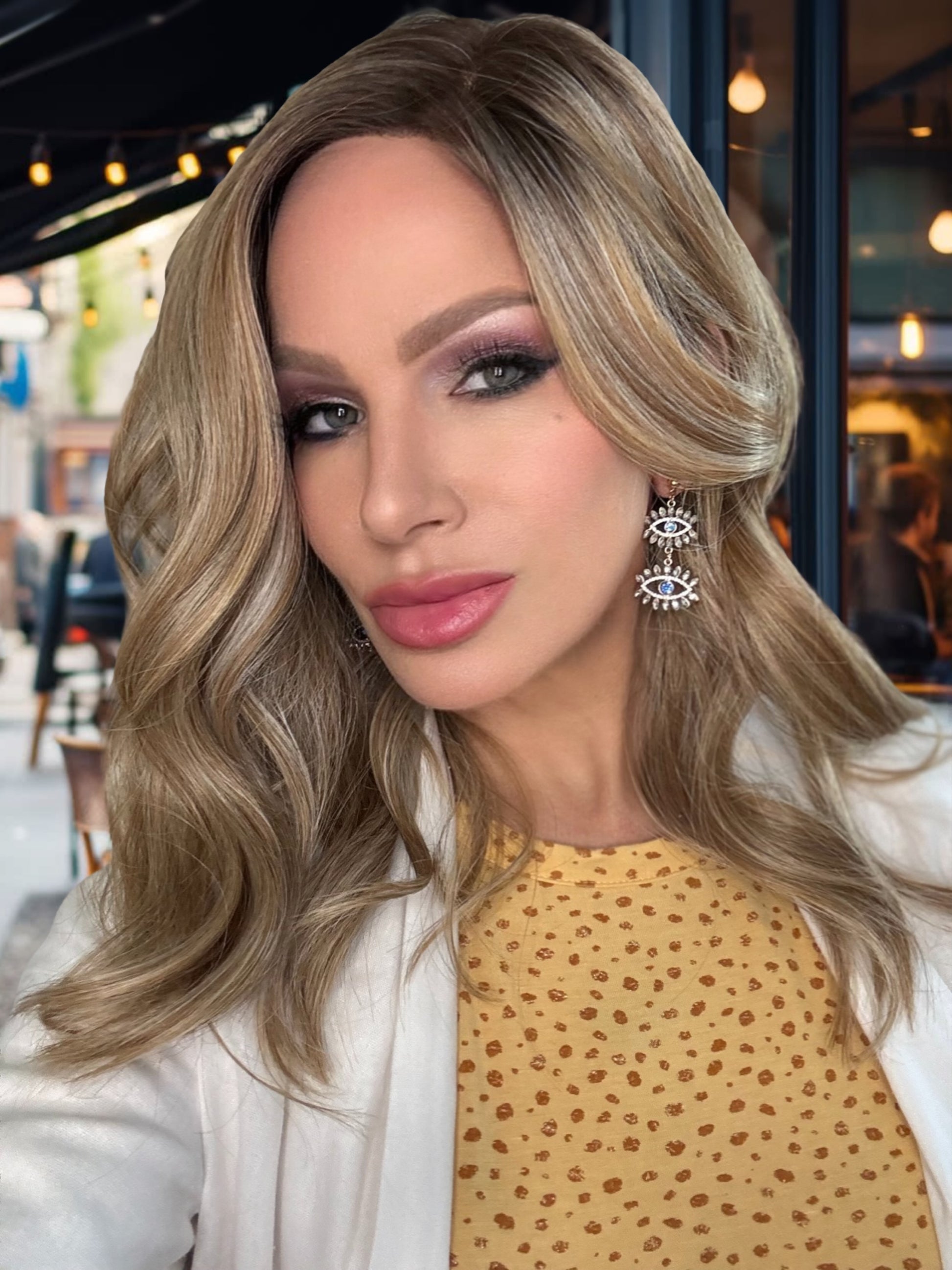 Meet Rumor," a stunning mid-length taupe and sandy  blonde monofilament.
