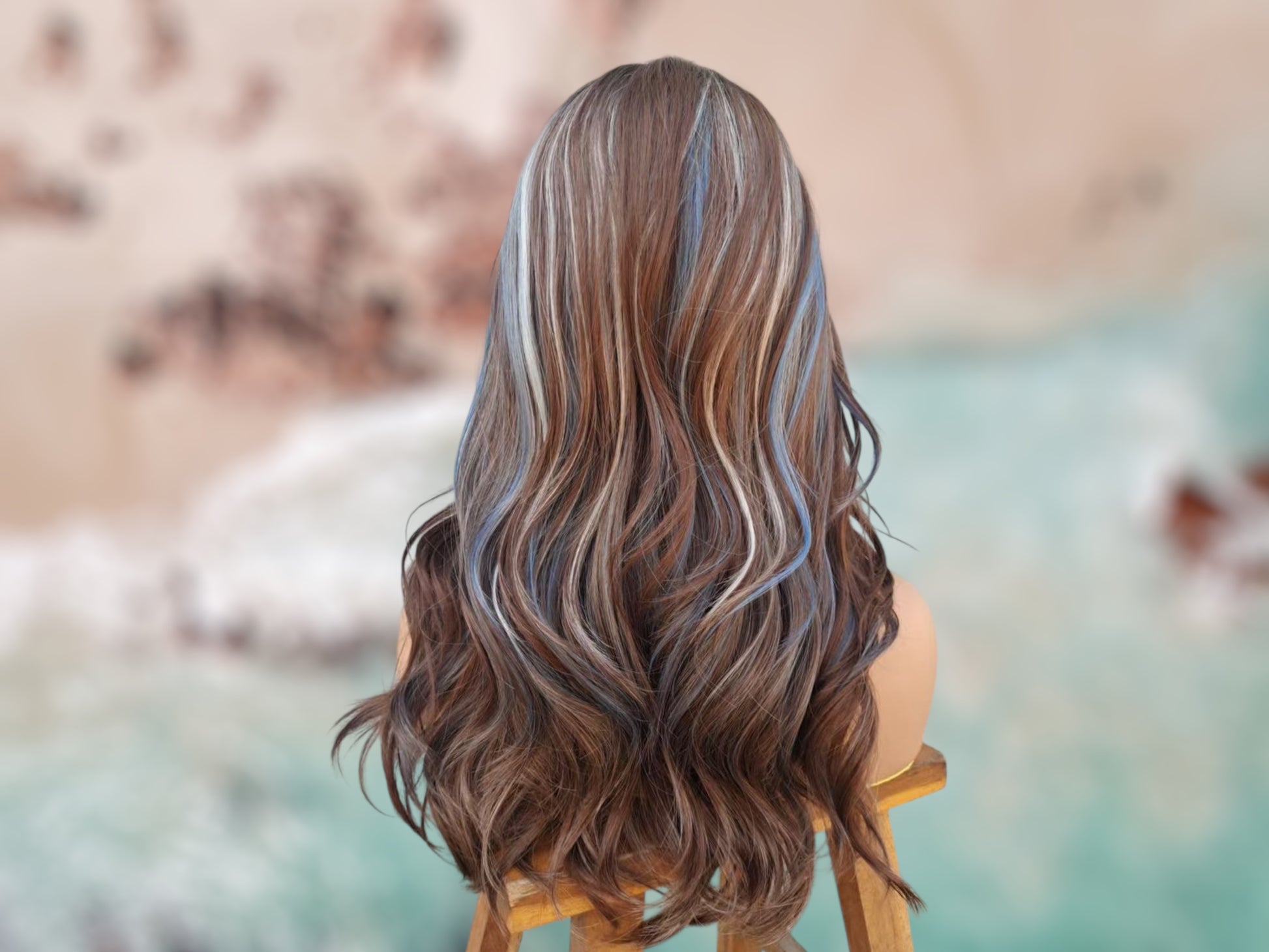 Multi-tone highlighting technique incorporating blonde, blue & brown. All photos are of the actual wig with exception of the last two photos, those last two are the inspiration photos created from AI that we used off of Pinterest .