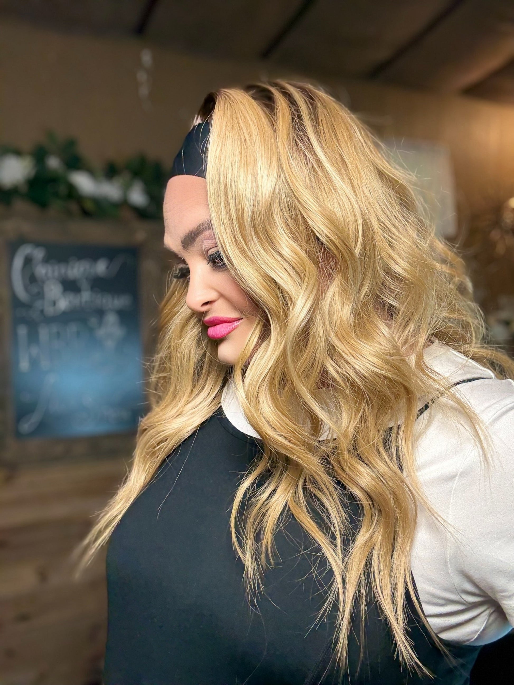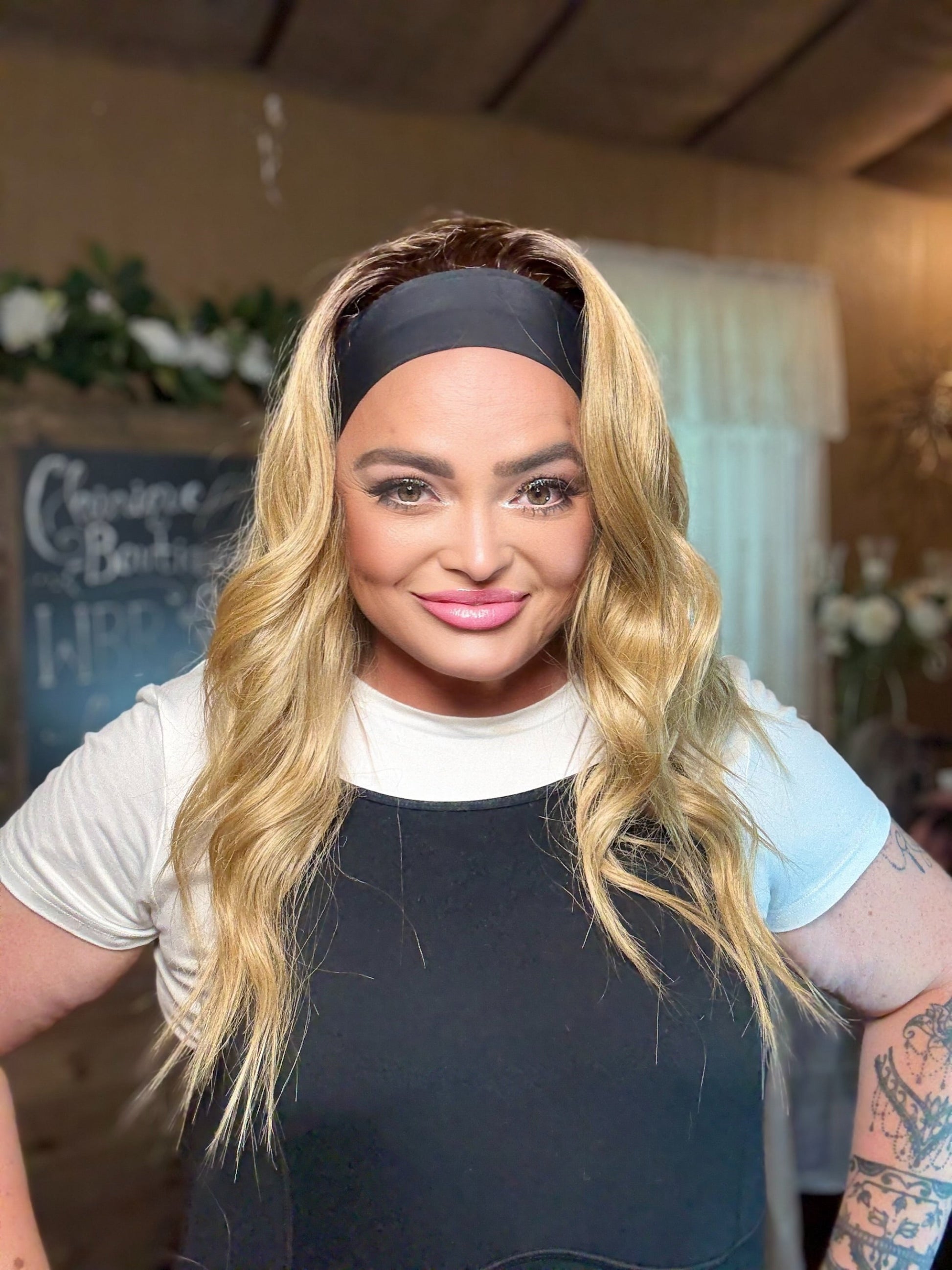 The RYAN headband ponytail wig features 22" loose Utah curls crafted from premium heat-resistant synthetic fiber, offering versatile styling in a stunning warm blonde shade. Designed with a black velcro headband and drawstrings at the nape, it transitions easily from a headband style to a sleek ponytail. Its cap accommodates petite to standard sizes, ensuring a comfortable and secure fit for everyday wear or special occasions.