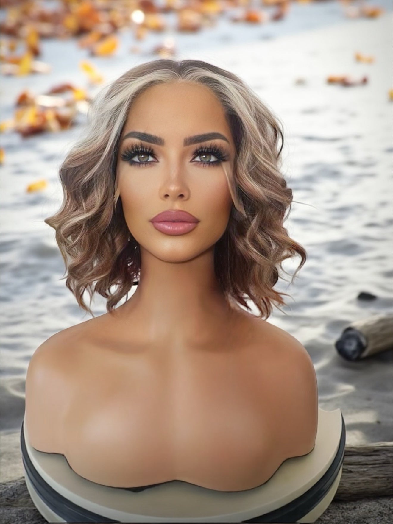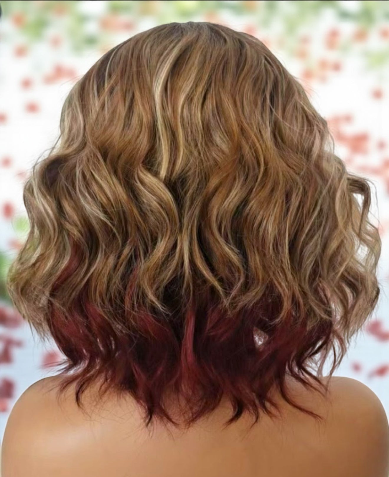 The SAILOR wig features a 13x4 lace front with a Scandinavian hairline for a natural look and versatile free parting. Crafted from premium heat-resistant synthetic fibers, it offers durable styling with soft 12" loose curls. The stunning dark blonde shade is uniquely accented with rose and burgundy tones underneath, adding depth and dimension. Designed to fit comfortably with adjustable straps and a standard cap size, it includes custom Aqualocks for enhanced durability and moisture resistance. Perfect for those seeking an expertly crafted, stylish, and easy-to-maintain synthetic wig.